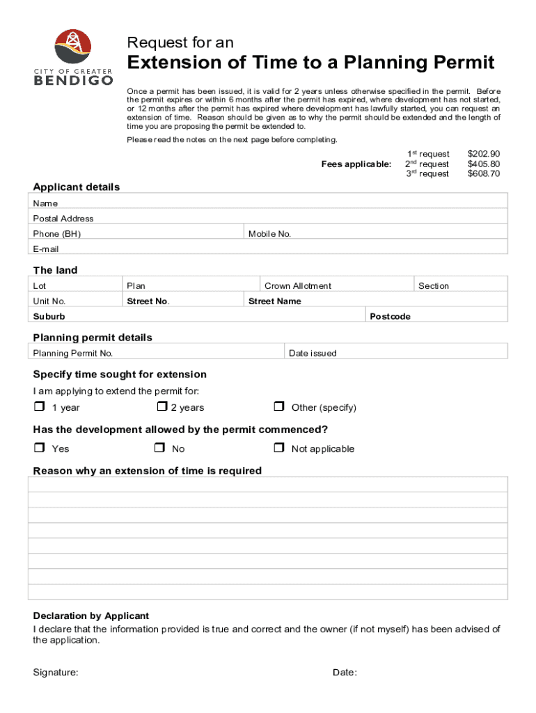 Request for extension of Time to a Planning Permit Once a permit has been issued, it is valid for 2 years unless otherwise specified in the permit. Before the permit expires or within 6 months after