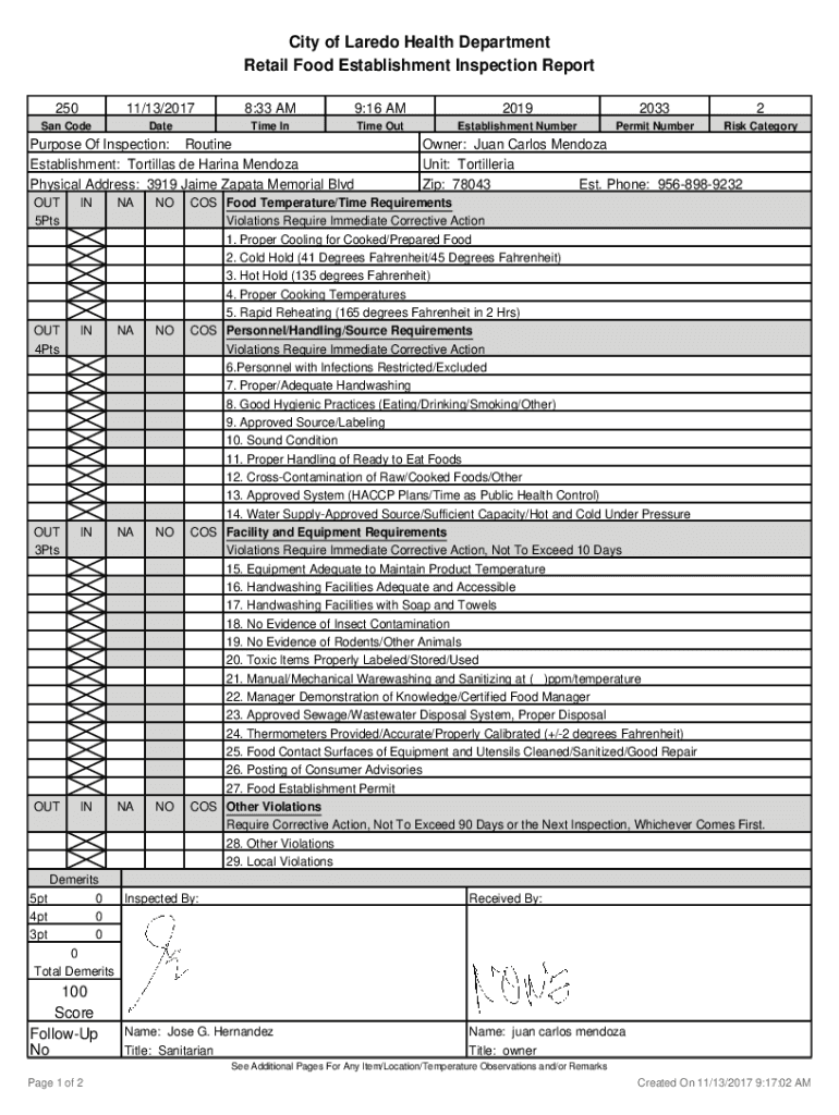 City of Laredo Health Department Retail Food Establishment Inspection Report 25011/13/20178:33 AM9:16 AM201920332San CodeDateTime Time Out Establishment NumberPermit Numbers CategoryPurpose Of Inspection: