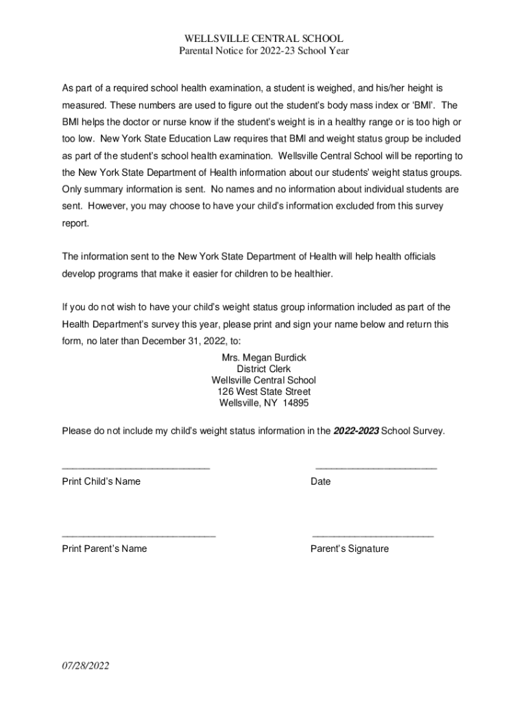 BELLEVILLE CENTRAL SCHOOL Parental Notice for 202223 School Years part of a required school health examination, a student is weighed, and his/her height is measured. These numbers are used to figure