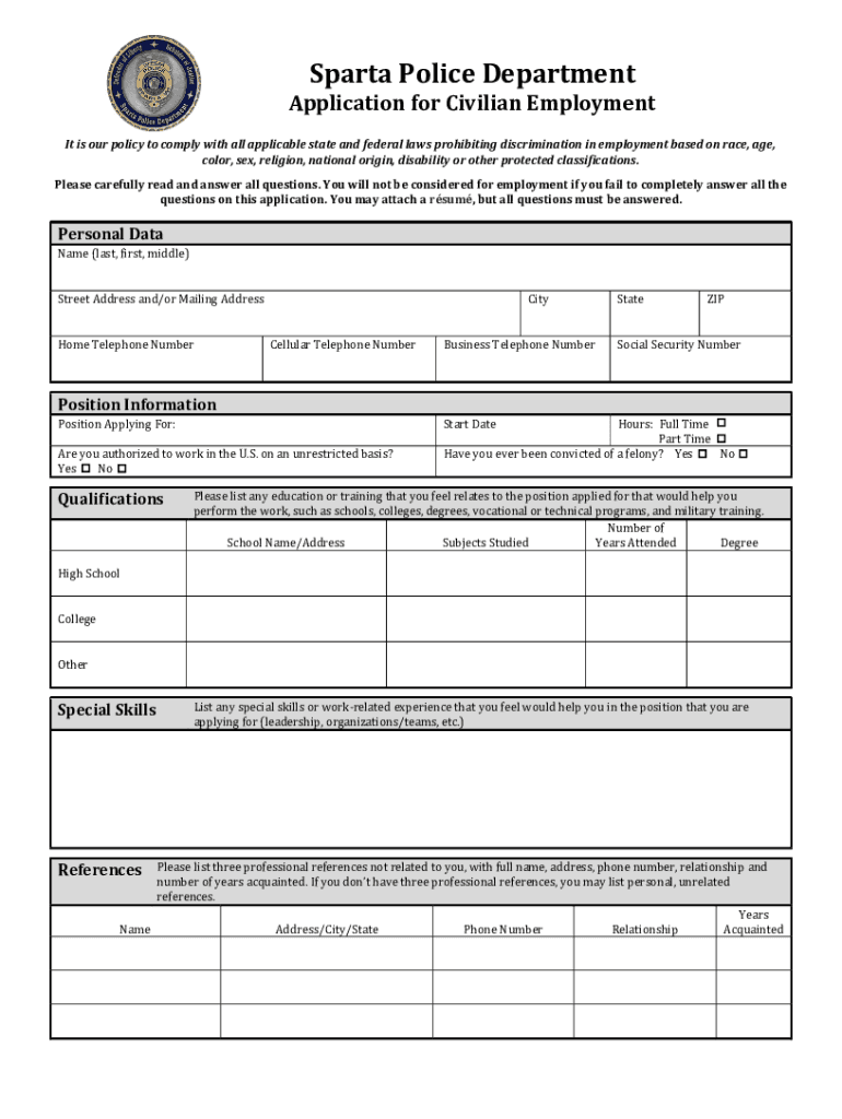 Sparta Police Departmentalization for Civilian Employment It is our policy to comply with all applicable state and federal laws prohibiting discrimination in employment based on race, age, color,