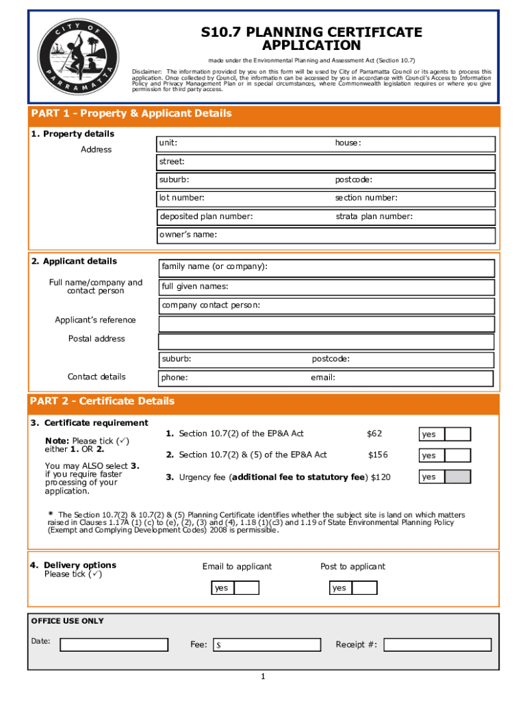 S10.7 PLANNING CERTIFICATE APPLICATION made under the Environmental Planning and Assessment Act (Section 10.7) Disclaimer: The information provided by you on this form will be used by City of Parramatta