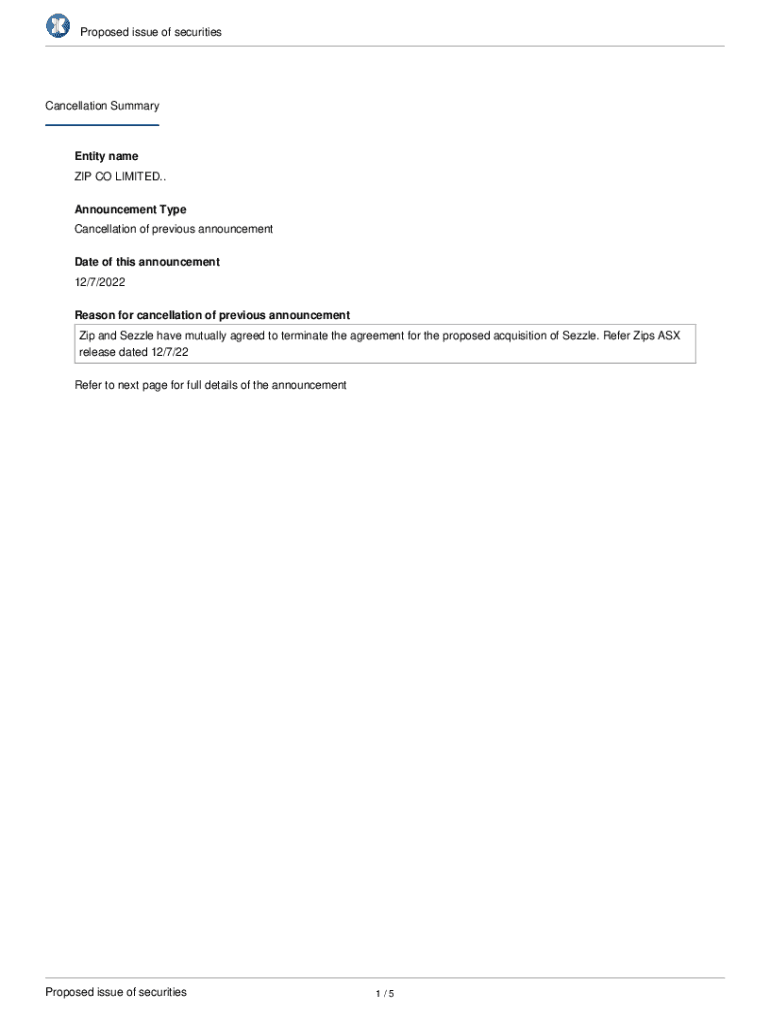 Proposed issue of securitiesCancellation SummaryEntity name ZIP CO LIMITED. Announcement Type Cancellation of previous announcement Date of this announcement 12/7/2022 Reason for cancellation of previous