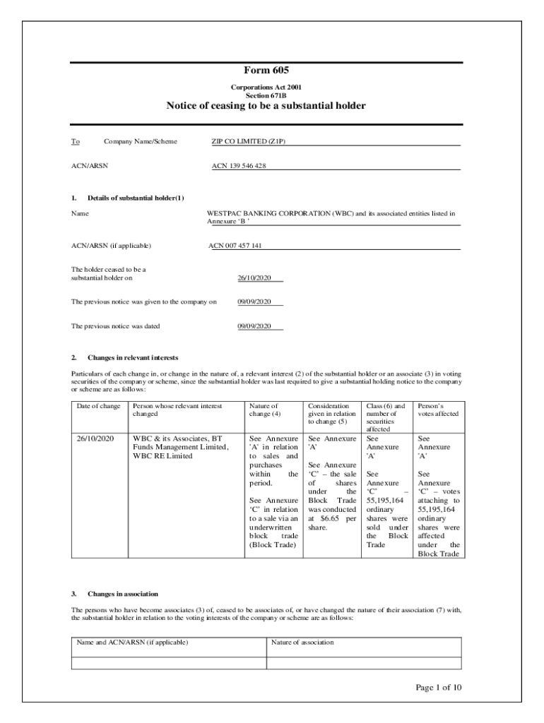 Form 605 Corporations Act 2001 Section 671BNotice of ceasing to be a substantial holderToCompany Name/Scheme ACN/ARSN1.ZIP CO LIMITED (Z1P)ACN 139 546 428Details of substantial holder(1)NameWESTPAC
