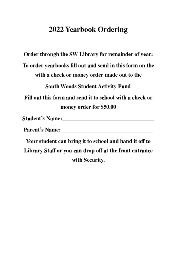 2022 Yearbook Ordering Order through the SW Library for remainder of year: To order yearbooks fill out and send in this form on the with a check or money order made out to the South Woods Student