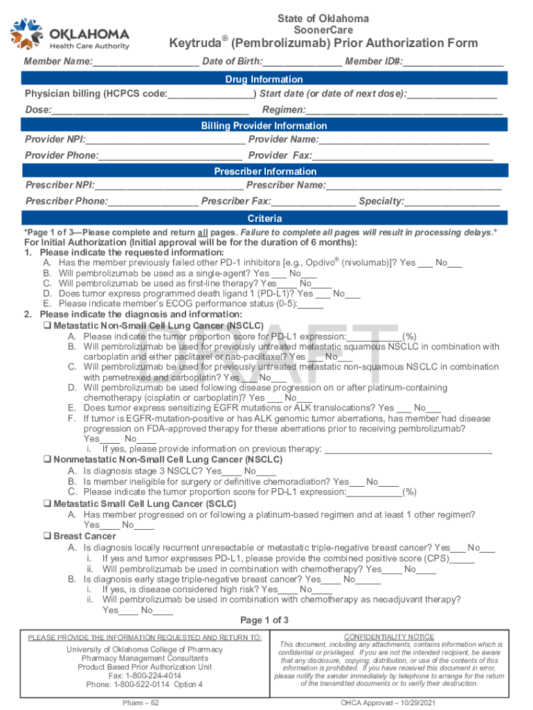 State of Oklahoma SoonerCareKeytruda (Pembrolizumab) Prior Authorization Form Member Name:___ Date of Birth:___ Member ID#:___ Drug Information Physician billing (HOPES code:___) Start date (or date