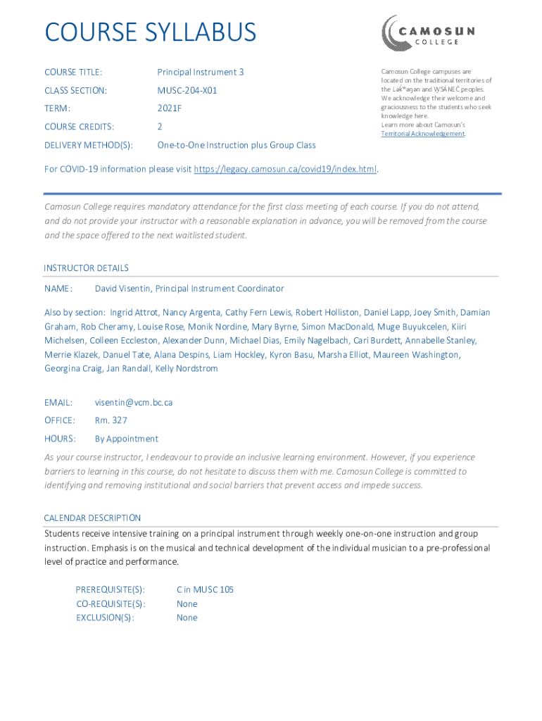 COURSE SYLLABUS COURSE TITLE:Principal Instrument 3CLASS SECTION:MUSC204X01TERM:2021FCOURSE CREDITS:2DELIVERY METHOD(S):Antoine Instruction plus Group ClassCamosun College campuses are located on