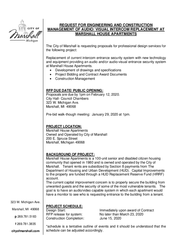 REQUEST FOR ENGINEERING AND CONSTRUCTION MANAGEMENT OF AUDIO/ VISUAL INTERCOM REPLACEMENT AT MARSHALL HOUSE APARTMENTS The City of Marshall is requesting proposals for professional design services