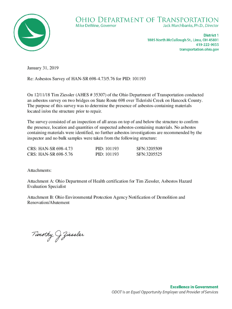 January 31, 2019, Re: Asbestos Survey of HANS 6984.73/5.76 for PID: 101193On 12/11/18 Tim Ziegler (AGES # 35307) of the Ohio Department of Transportation conducted an asbestos survey on two bridges