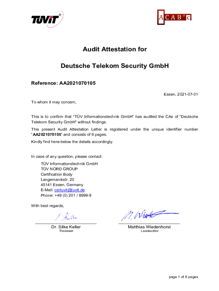 Space LOGO Audit Attestation for Deutsche Telekom Security GmbH Reference: AA2021070105 Essen, 20210701 To whom it may concern, This is to confirm that TV Informationstechnik GmbH has audited the