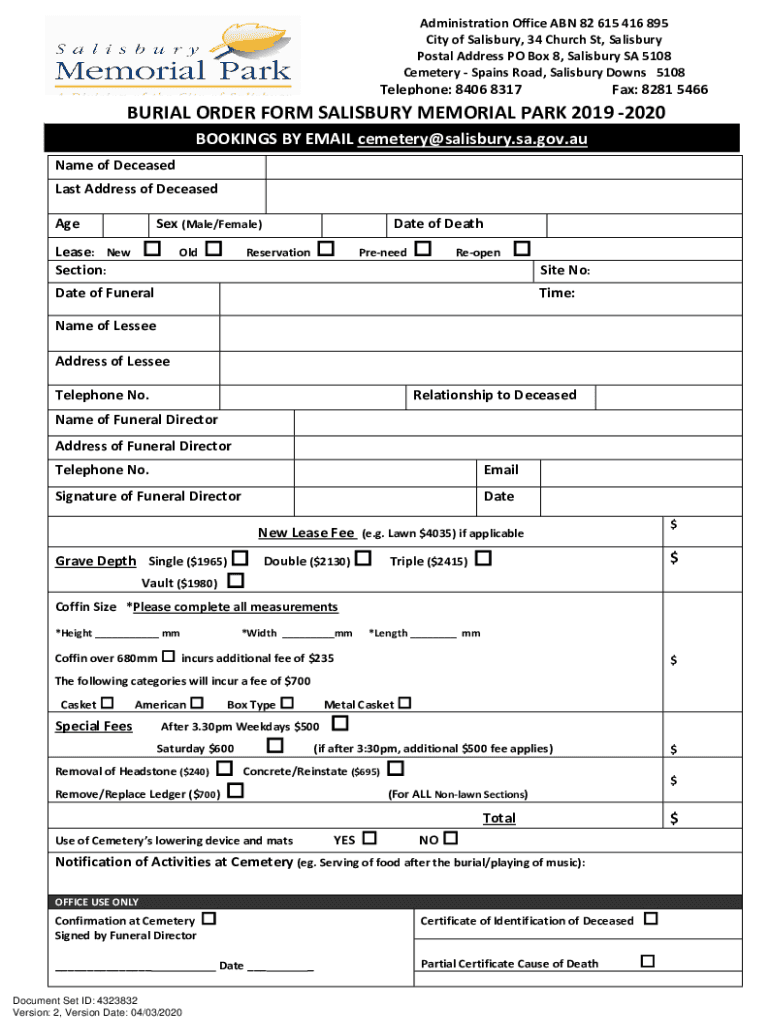 Fill out your ecm4323832v2burial order form 201920 online with pdfFiller!