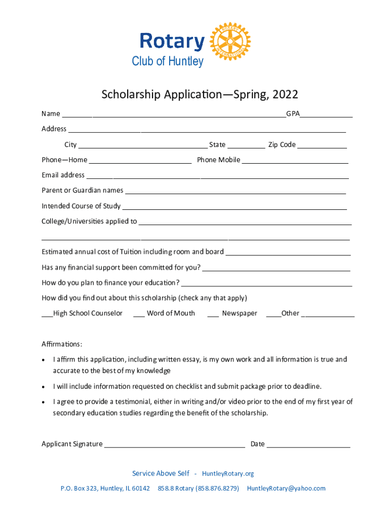 Club of Huntley Scholarship ApplicationSpring, 2022 Name ___GPA___ Address ___ City ___ State ___ Zip Code ___ Phoneme ___ Phone Mobile ___ Email address ___ Parent or Guardian names ___ Intended