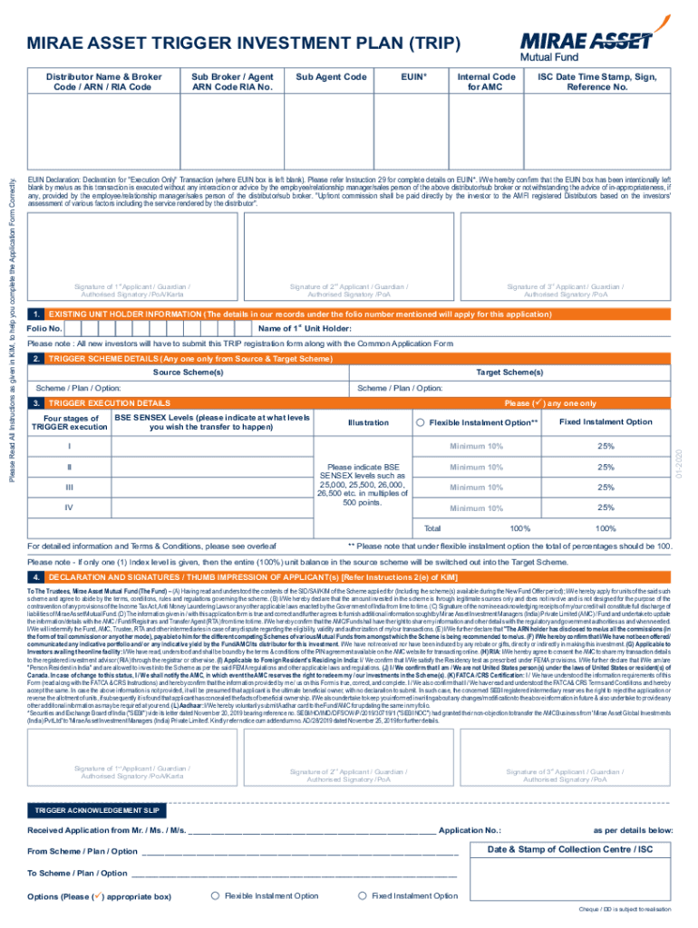 MIRA ASSET TRIGGER INVESTMENT PLAN (TRIP) Sub Broker / Agent ARN Code RIA No. Sub Agent Couperin×Internal Code for AM CISC Date Time Stamp, Sign, Reference No. RUIN Declaration: Declaration for \”