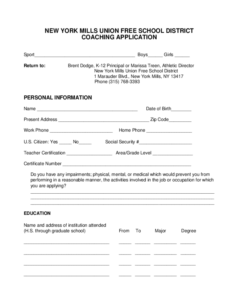 NEW YORK MILLS UNION FREE SCHOOL DISTRICT COACHING APPLICATION Sport___ Boys___ Girls ___ Return to:Brent Dodge, K12 Principal or Marissa Green, Athletic Director New York Mills Union Free School