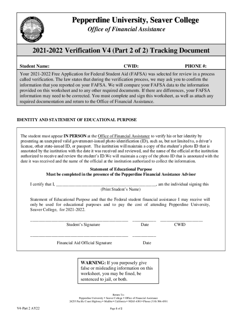 Pepper dine University, Server College Office of Financial Assistance20212022 Verification V4 (Part 2 of 2) Tracking Document Student Name:CID:PHONE #:Your 20212022 Free Application for Federal Student