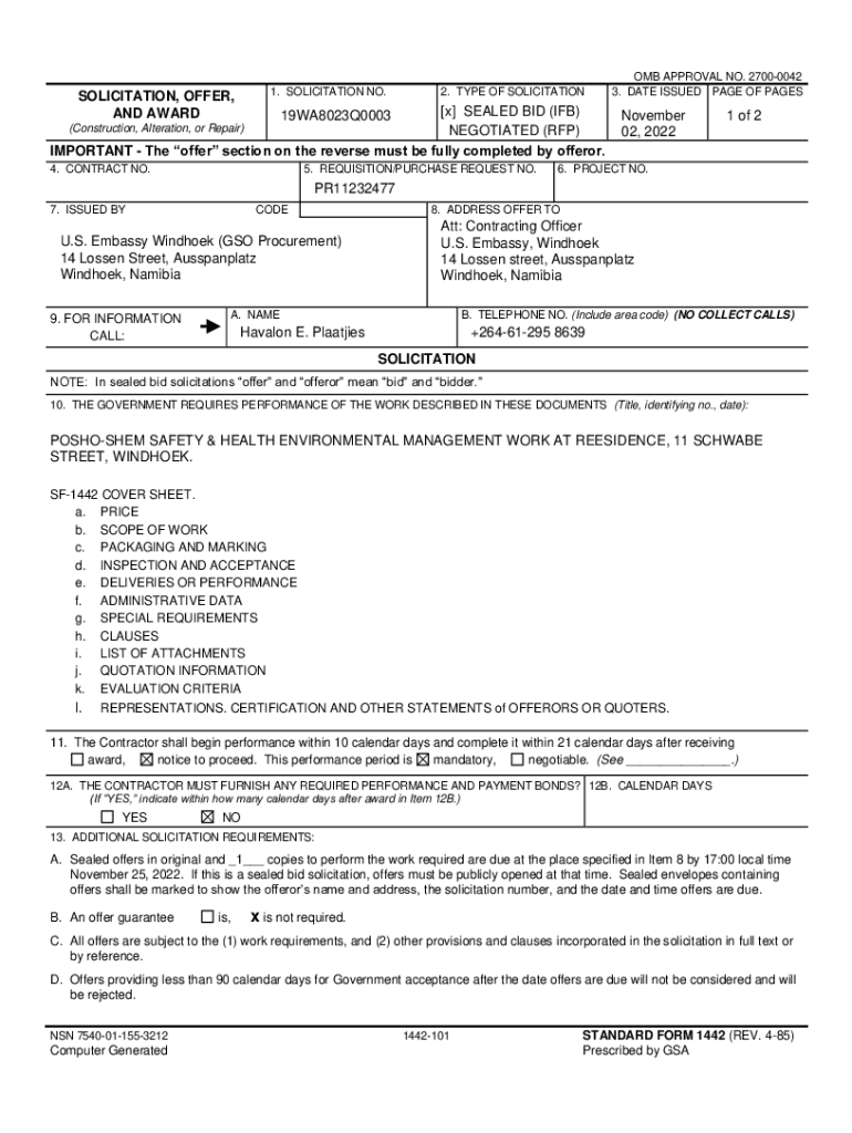 1. SOLICITATION NO.SOLICITATION, OFFER, AND AWARD2. TYPE OF SOLICITATION[x] SEALED BID (IF) NEGOTIATED (RFP) IMPORTANT The offer section on the reverse must be fully completed by offer or. 19WA8023Q0003(Construction,