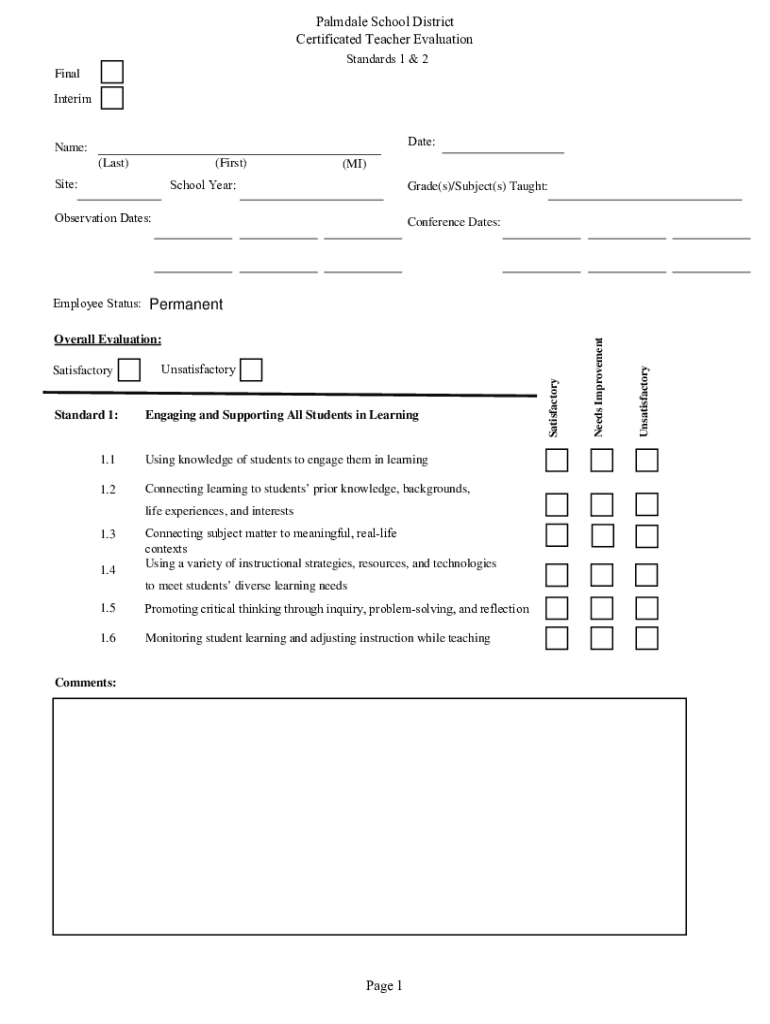Palmdale School District Certificated Teacher Evaluation Standards 1 & 2 FinalInterim Date:Name: (Last)(First)Site:(MI)School Year:Grade(s)/Subject(s) Taught:Observation Dates:Conference Dates:Standard