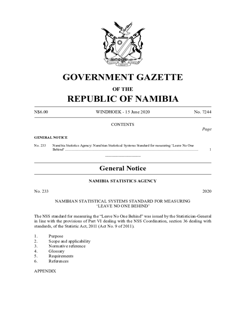 GOVERNMENT GAZETTE OF REPUBLIC OF NAMIBIA N$6.00WINDHOEK 15 June 2020CONTENTSNo. 7244PageGENERAL NOTICE No. 233Namibia Statistics Agency: Namibian Statistical Systems Standard for measuring Leave