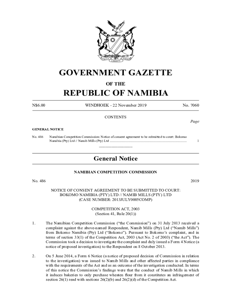 GOVERNMENT GAZETTE OF REPUBLIC OF NAMIBIA N$6.00WINDHOEK 22 November 2019CONTENTSNo. 7060PageGENERAL NOTICE No. 486Namibian Competition Commission: Notice of consent agreement to be submitted to court: