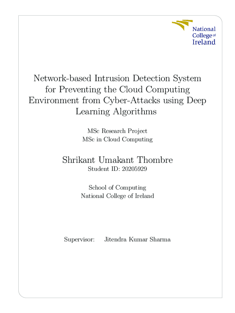 Network based Intrusion Detection System for Preventing the Cloud Computing Environment from CyberAttacks using Deep Learning Algorithms M.Sc. Research Project M.Sc. in Cloud ComputingShrikant Making