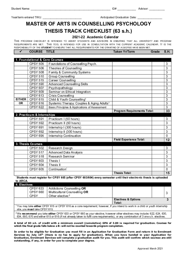 Student Name: ___ ID# ___ Advisor: ___ Year/term entered TWU: ___Anticipated Graduation Date: ___MASTER OF ARTS IN COUNSELLING PSYCHOLOGY THESIS TRACK CHECKLIST (63 s.h.) 202122 Academic CalendarTHISPROGRAM