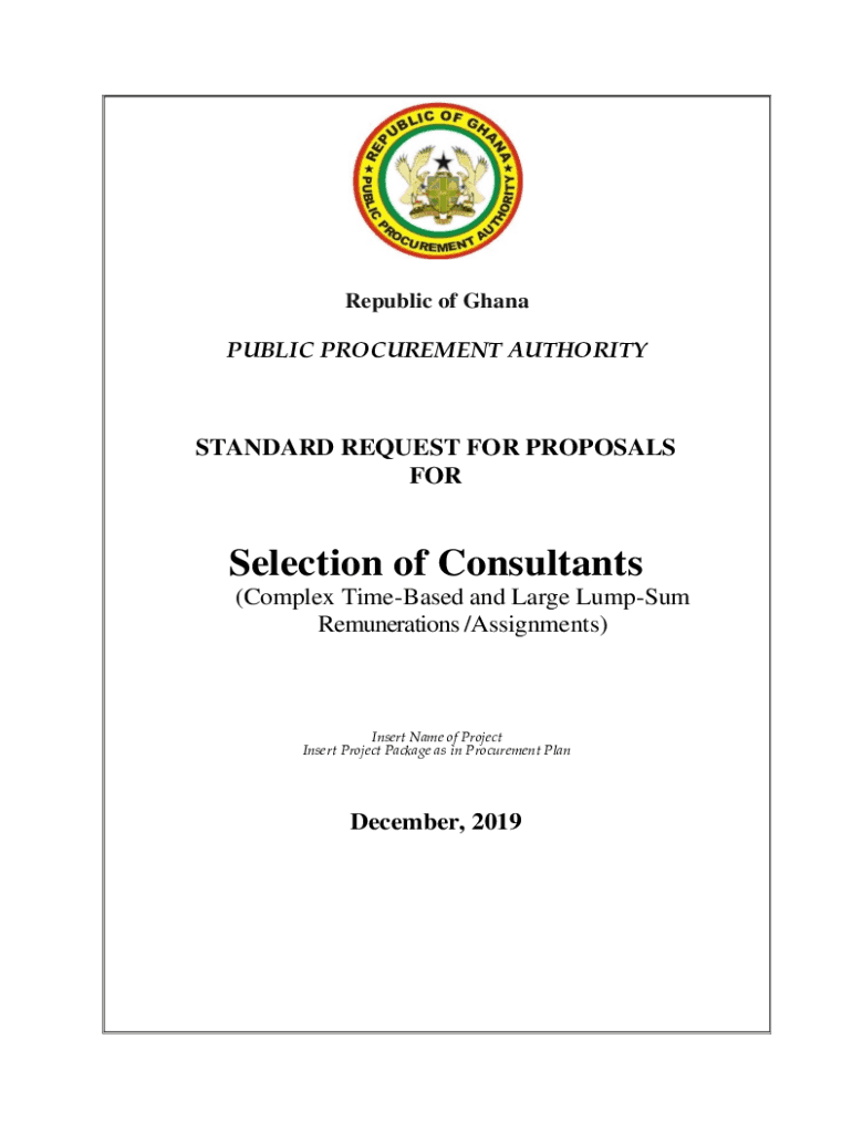 Republic of Ghana PUBLIC PROCUREMENT AUTHORITYSTANDARD REQUEST FOR PROPOSALS Selection of Consultants (Complex Timeboxed and Large LumpSum Remunerations /Assignments)Insert Name of Project Insert