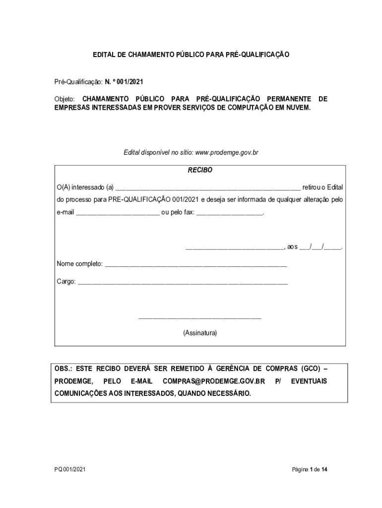 O propósito é selecionar fornecedores de tecnologia da informação para prestação de serviços à Prodemge.