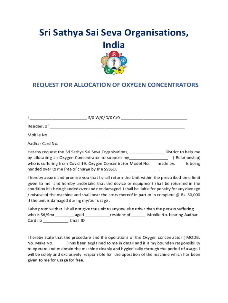 Sri Satya SAI Sea Organizations, IndiaREQUEST FOR ALLOCATION OF OXYGEN CONCENTRATORS ___ S/0 W/0/D/0 C/0 ___ Resident of ___ Mobile No___ Aadhaar Card No. Hereby request the Sri Satya SAI Sea Organizations,