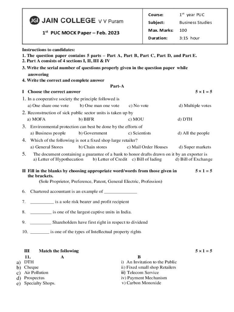 1st PUC MOCK Paper Feb. 2023Course:1st year Subject:Business Studies Max. Marks:100Duration:3:15 hourInstructions to candidates: 1. The question paper contains 5 parts Part A, Part B, Part C, Part