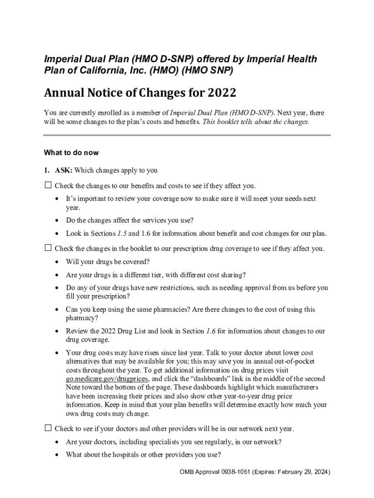 Imperial Dual Plan (HMO DSP) offered by Imperial Health Plan of California, Inc. (HMO) (HMO SNP)Annual Notice of Changes for 2022 You are currently enrolled as a member of Imperial Dual Plan (HMO