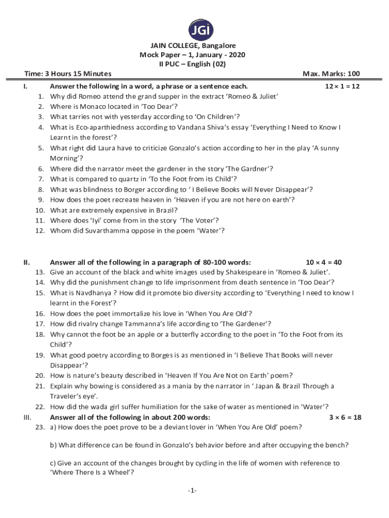 JAIN COLLEGE, Bangalore Mock Paper 1, January 2020 II PUC English (02) Time: 3 Hours 15 Minutes I. 1. 2. 3. 4. 5. 6. 7. 8. 9. 10. 11. 12.II. 13. 14. 15. 16. 17. 18. 19. 20. 21. 22.III. 23. Max. Marks: