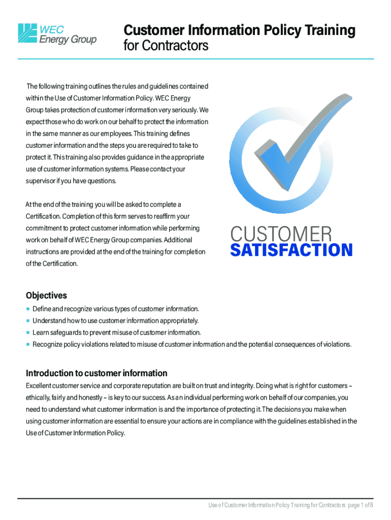 Customer Information Policy Training for Contractors The following training outlines the rules and guidelines contained within the Use of Customer Information Policy. WEC Energy Group takes protection