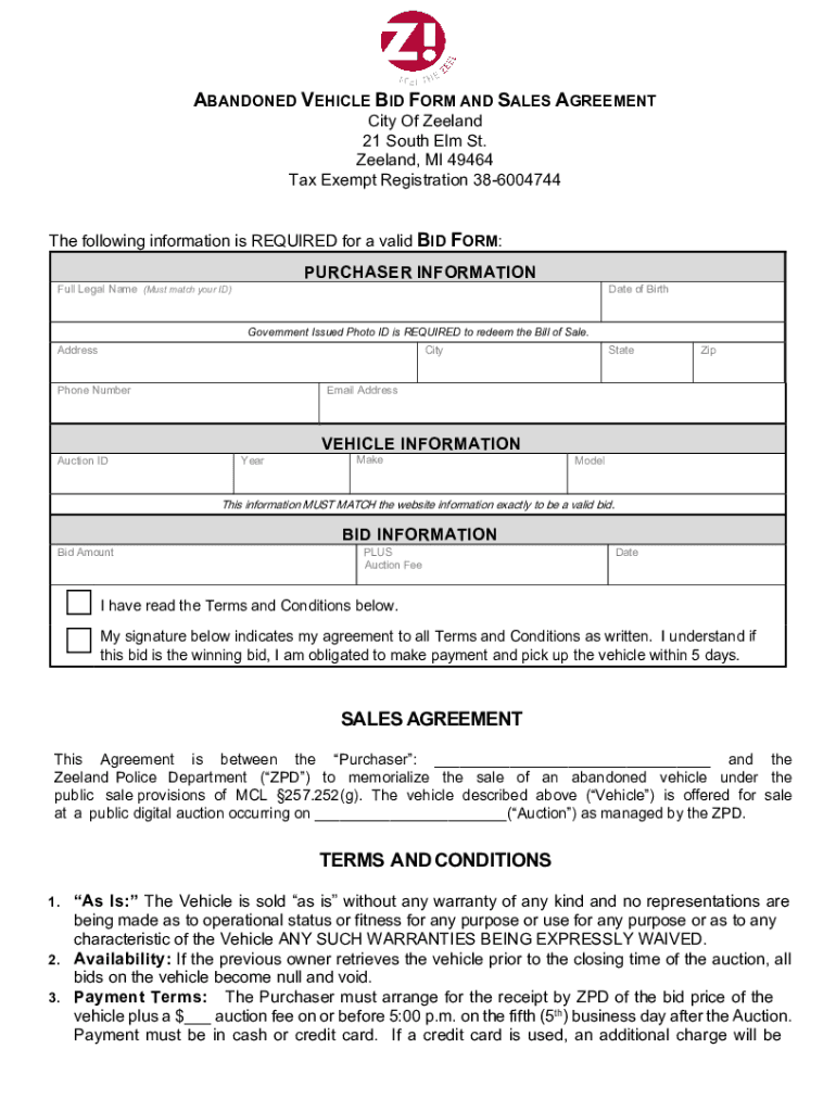 NOTICE Zeeland Police Department Abandoned Vehicle Auction Sealed Bid Only All vehicles are sold AS IS and all bids are binding offers to purchase. Please refer to the website posting for all available