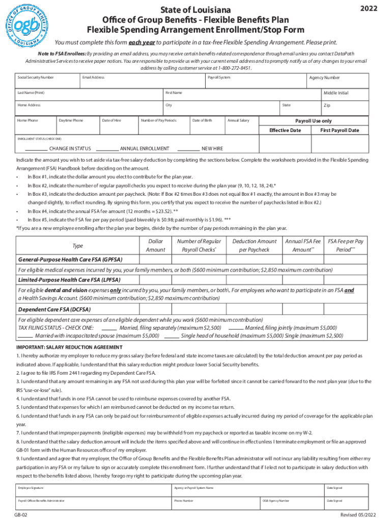 2022State of Louisiana Office of Group Benefits Flexible Benefits Plan Flexible Spending Arrangement Enrollment/Stop Form You must complete this form each year to participate in a tax-free Flexible