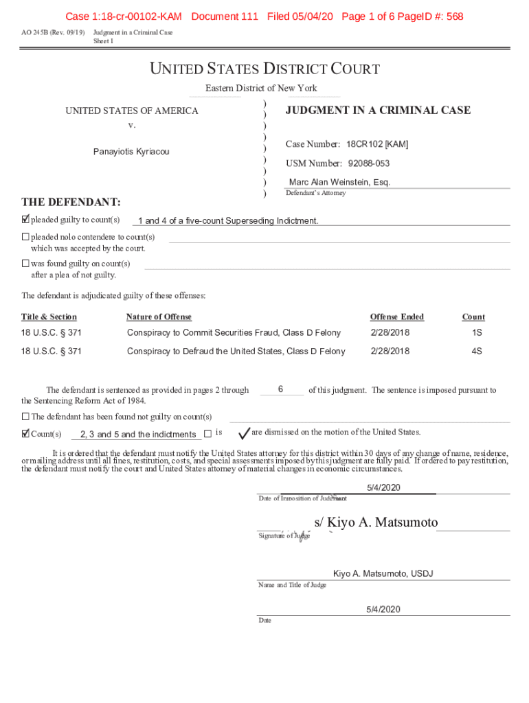 Case 1:18cr00102KAM Document 111 Filed 05/04/20-Page 1 of 6 Paged #: 568 AO 245B (Rev. 09/19)Judgment in a Criminal Case Sheet 1UNITED STATES DISTRICT COURT Eastern District of New York ___ District