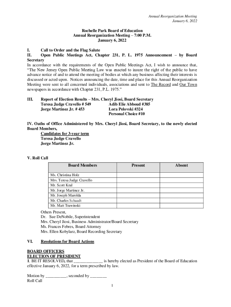 Annual Reorganization Meeting January 6, 2022Rochelle Park Board of Education Annual Reorganization Meeting 7:00 P.M. January 6, 2022, I. Call to Order and the Flag Salute II. Open Public Meetings