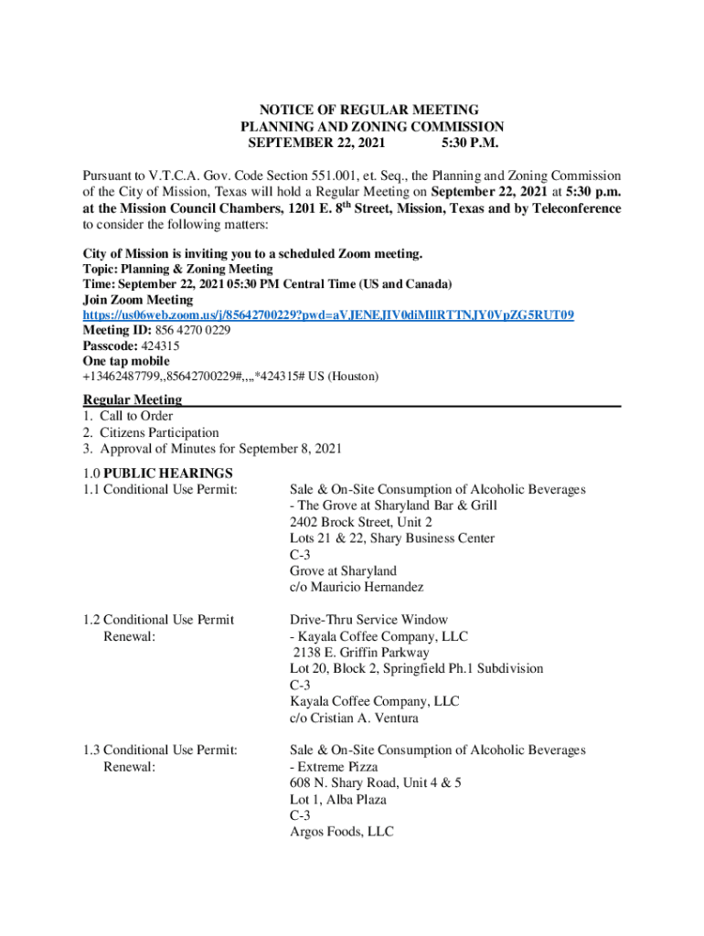 NOTICE OF REGULAR MEETING PLANNING AND ZONING COMMISSION SEPTEMBER 22, 2021 5:30 P.M. Pursuant to V.T.C.A. Gov. Code Section 551.001, ET. Seq., the Planning and Zoning Commission of the City of Mission,