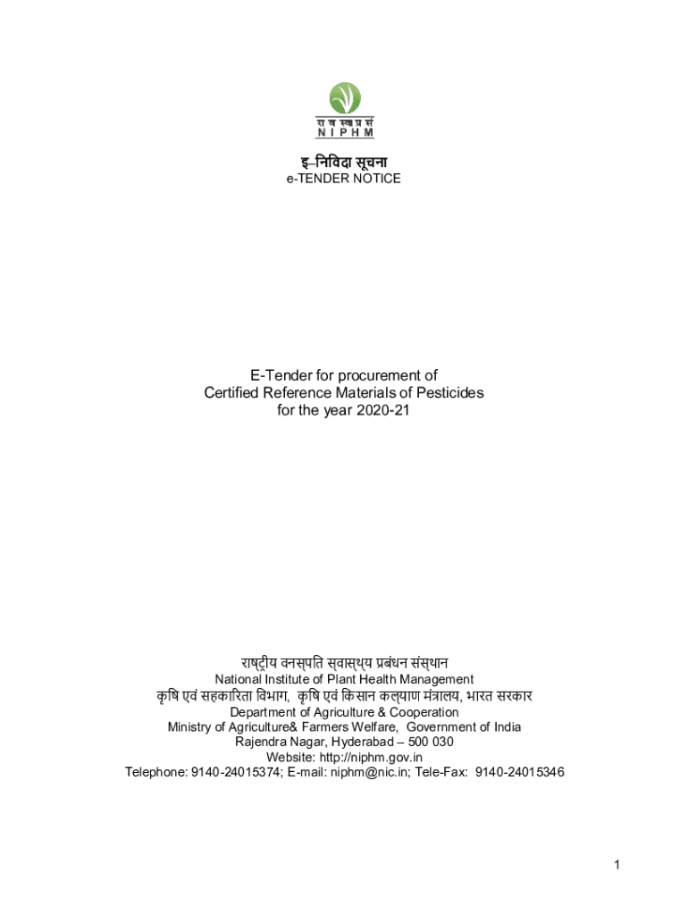 TENDER NOTICEETender for procurement of Certified Reference Materials of Pesticides for the year 202021 National Institute of Plant Health Management, Department of Agriculture