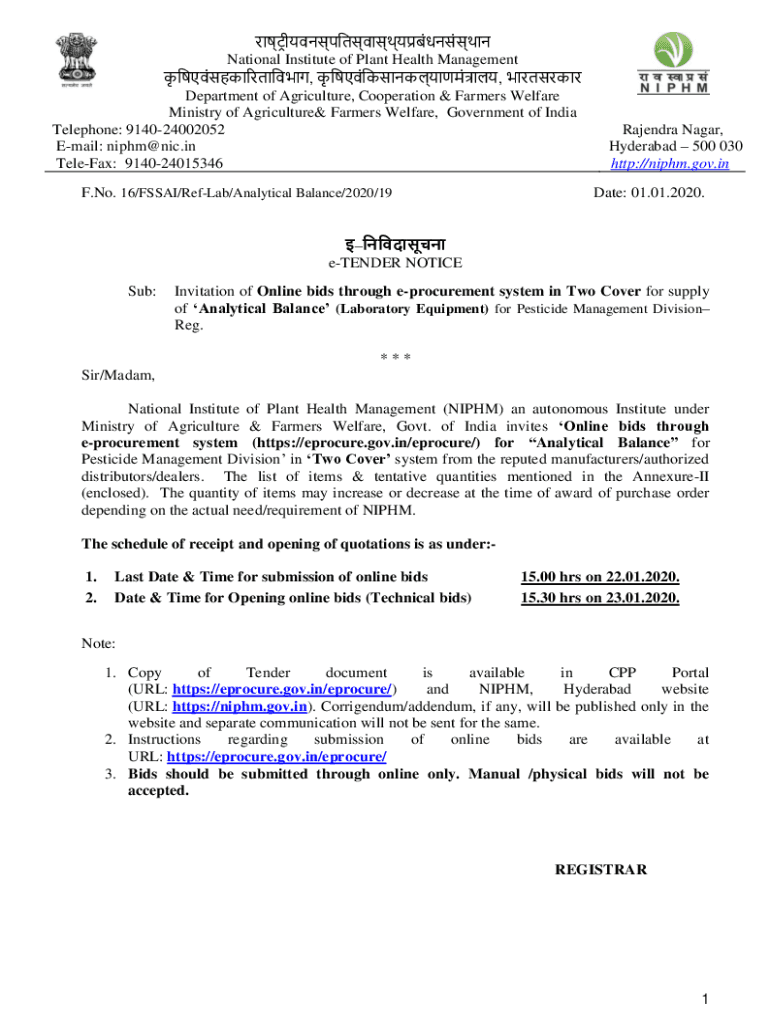 National Institute of Plant Health Management, Department of Agriculture, Cooperation & Farmers Welfare Ministry of Agriculture Farmers Welfare, Government of India Telephone: 914024002052 Email: