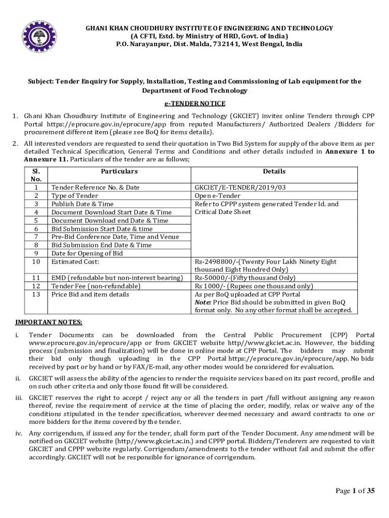 GHANA KHAN CHOUDHURY INSTITUTE OF ENGINEERING AND TECHNOLOGY (A CTI, ESD. By Ministry of HRD, Govt. of India) P.O. Narayana, Dist. Malta, 732141, West Bengal, IndiaSubject: Tender Inquiry for Supply,