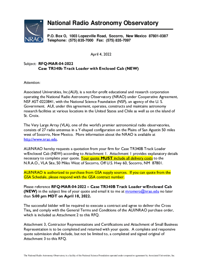National Radio Astronomy Observatory P.O. Box O, 1003 Louisville Road, Socorro, New Mexico 878010387 Telephone: (575) 8357000 Fax: (575) 8357097April 4, 2022 Subject: RFQMAR042022 Case TR340b Track