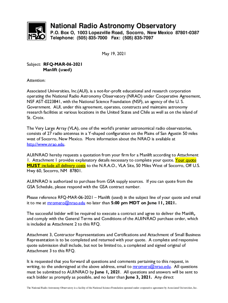 National Radio Astronomy Observatory P.O. Box O, 1003 Louisville Road, Socorro, New Mexico 878010387 Telephone: (505) 8357000 Fax: (505) 8357097 May 19, 2021, Subject: RFQMAR062021 Man lift (used)