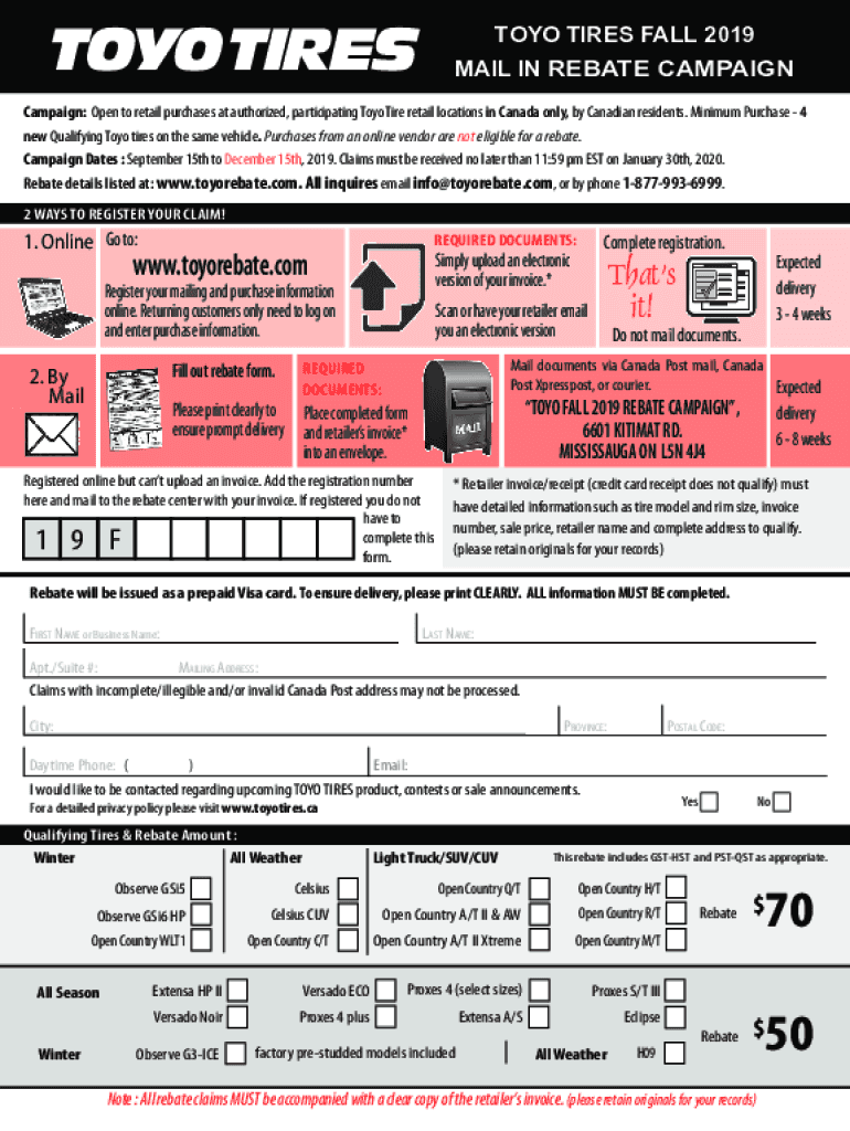 TOO TIRES FALL 2019 MAIL-IN REBATE CAMPAIGN: Open to retail purchases at authorized, participating To Tire retail locations in Canada only, by Canadian residents. Minimum Purchase 4 new Qualifying