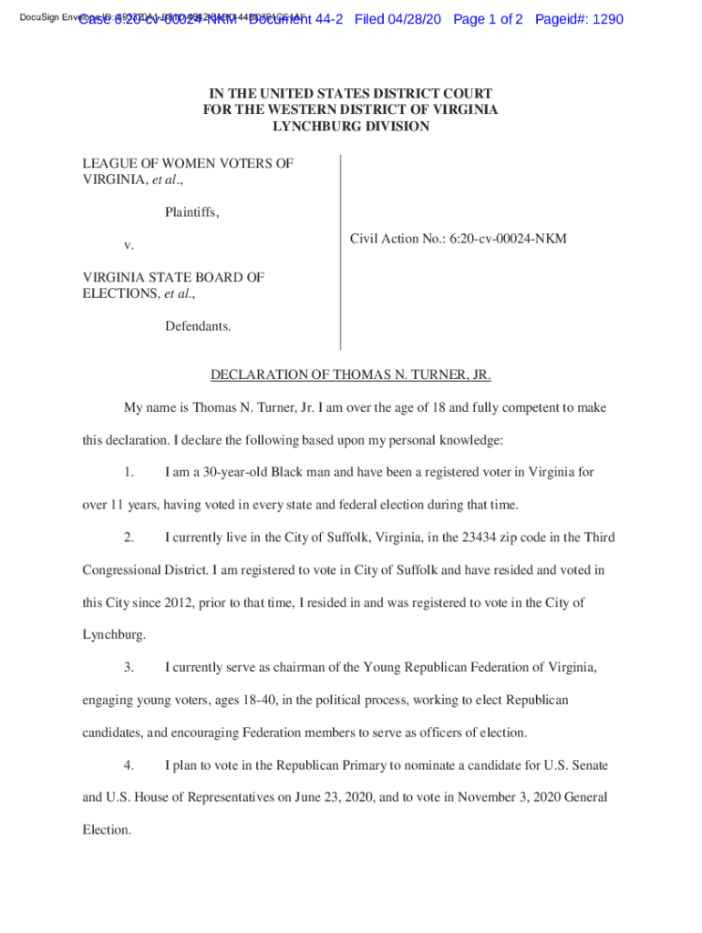 Case 6:20cv00024NKM Document442 Filed 04/28/20-Page 1 of 2 Pagan#: 1290IN THE UNITED STATES DISTRICT COURT FOR THE WESTERN DISTRICT OF VIRGINIA LYNCHBURG DIVISION LEAGUE OF WOMEN VOTERS OF VIRGINIA,