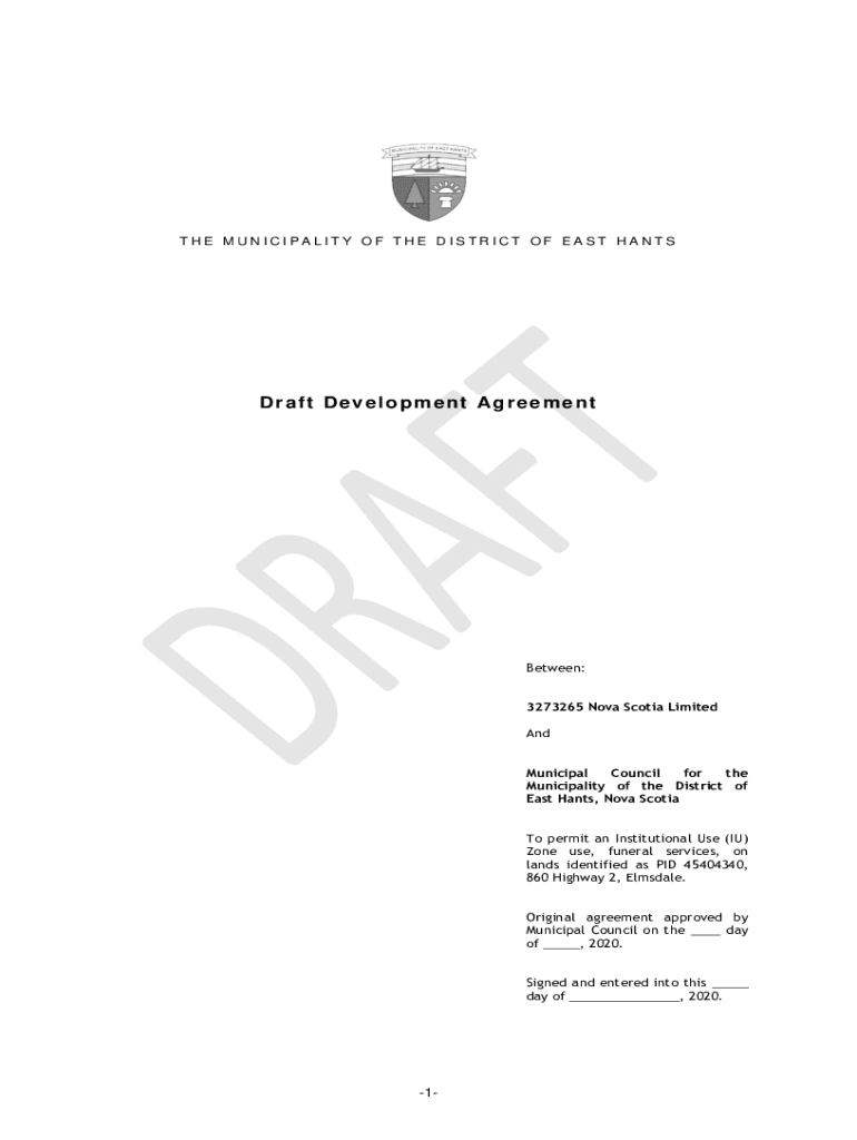 THE MUNICIPALITY OF THE DISTRICT OF EAST HAND r an f t D e v e l o pm e n t Ag r e e m e n between: 3273265 Nova Scotia Limited And Municipal Council for the Municipality of the District of East Hands,