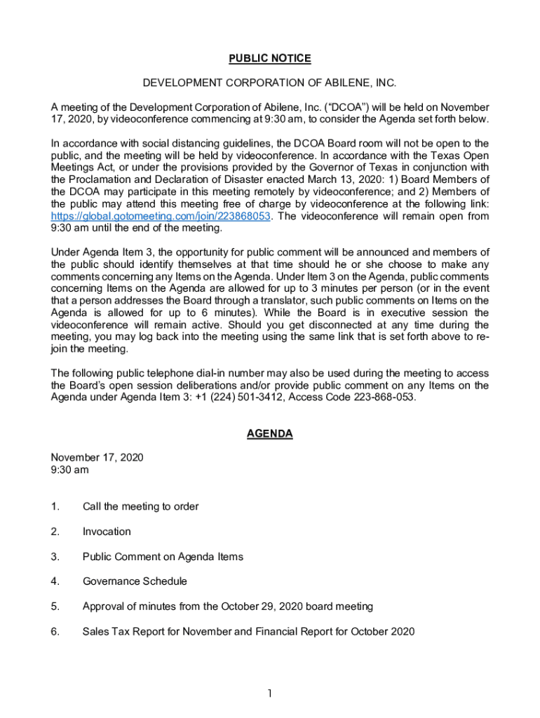 PUBLIC NOTICE DEVELOPMENT CORPORATION OF ABILENE, INC. A meeting of the Development Corporation of Abilene, Inc. (DOA) will be held on November 17, 2020, by videoconference commencing at 9:30 am,