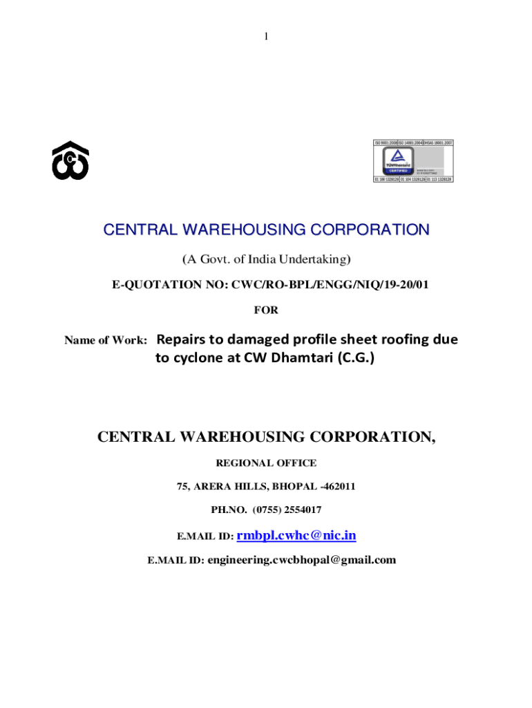 1CENTRAL WA REHOUSING CORPORATION (A Govt. of India Undertaking) QUOTATION NO: CWC/RO BPL/EGG/IQ/1920/01 Forename of Work:Repairs to damaged profile sheet roofing due to cyclone at CW Atari (C.G.)CENTRAL