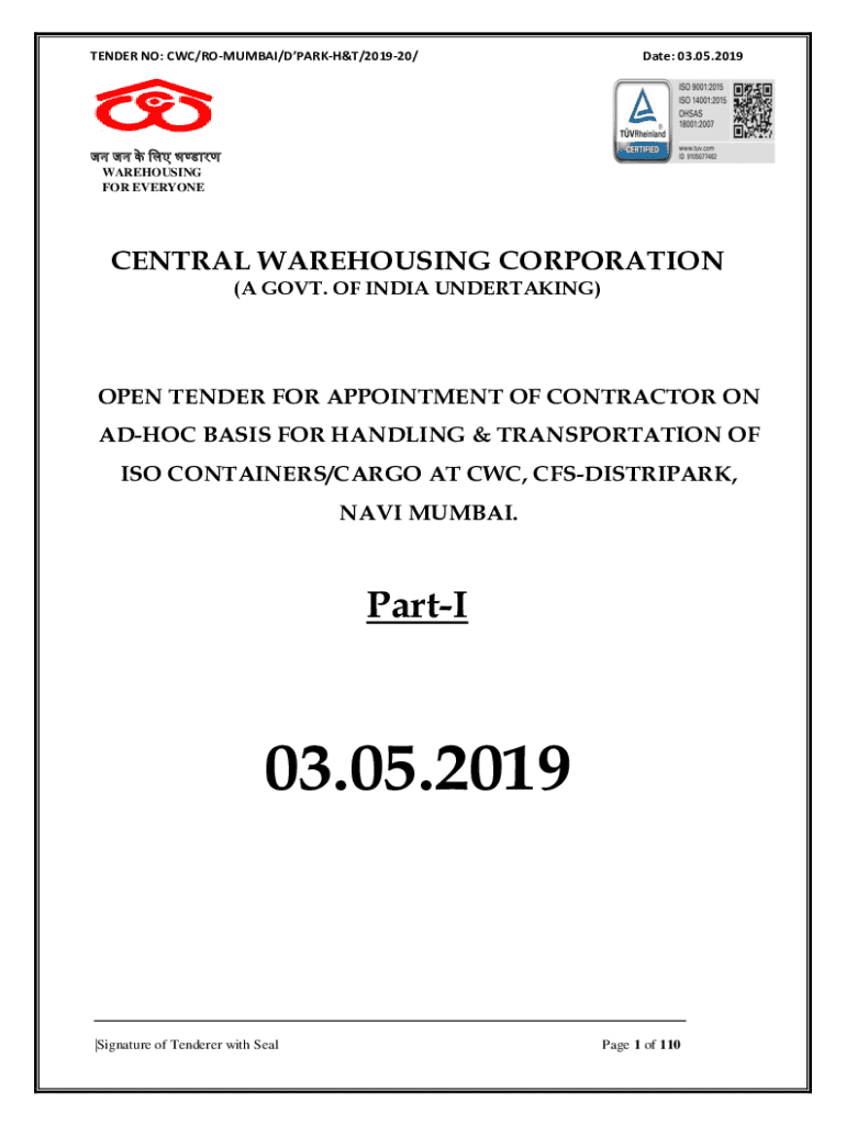 TENDER NO: CWC/MUMBAI/DARKEST/201920/Date: 03.05.2019 WAREHOUSING FOR EVERYONECENTRAL WAREHOUSING CORPORATION (A GOVT. OF INDIA UNDERTAKING)OPEN TENDER FOR APPOINTMENT OF CONTRACTOR ON HOC BASIS FOR