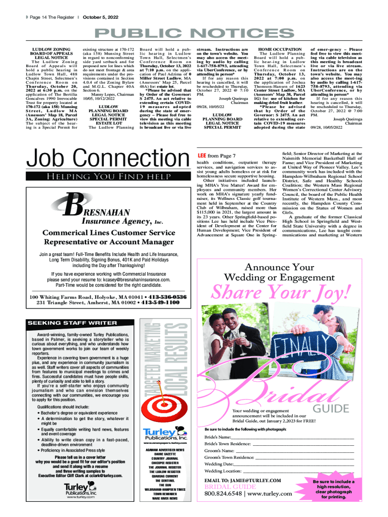 Page 14 The Register October 5, 2022PUBLIC NOTICES LUDO ZONING BOARD OF APPEALS LEGAL NOTICE T h e L u d l ow Z o n i n g Board of Appeals will hold a public hearing in Ludo Town Hall, 488 Chain Street,
