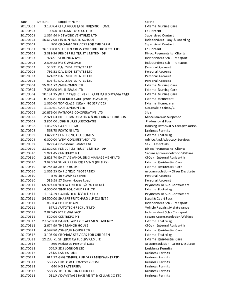 Date Amount Supplier Name 20170502 3,189.64 CHEAP COTTAGE NURSING HOME 20170503 909.6 TOUCAN TOOL CO LTD 20170503 1,084.86 NETWORK VENTURES LTD 20170503 16,657.98 HINTON HOUSE SCHOOL 20170503 900
