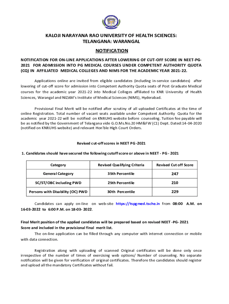 KANJI NARAYANA RAN UNIVERSITY OF HEALTH SCIENCES: TELANGANA: WARANGAL NOTIFICATION FOR ONLINE APPLICATIONS AFTER LOWERING OF CUTOFF SCORE IN NEETPG2021 FOR ADMISSION INTO PG MEDICAL COURSES UNDER